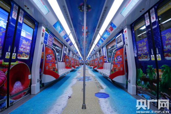 央廣網(wǎng)合肥9月4日消息 日前,“歡樂號”主題車廂正式登陸合肥地鐵1號線。值得一提是,車廂地面描繪著沙灘和波浪的美景,墻壁背景為深藍(lán)色,頗具匠心的3D立體設(shè)計(jì)更是引來乘客們的一致稱贊。