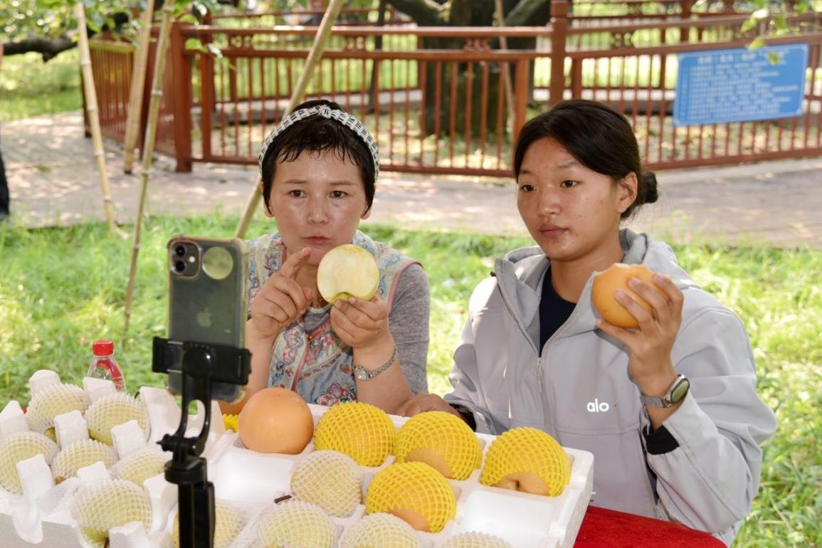 碭山縣果農(nóng)張雪芝(左)在梨樹王景區(qū)直播銷售碭山梨(央廣網(wǎng)發(fā) 碭山縣委宣傳部供圖)