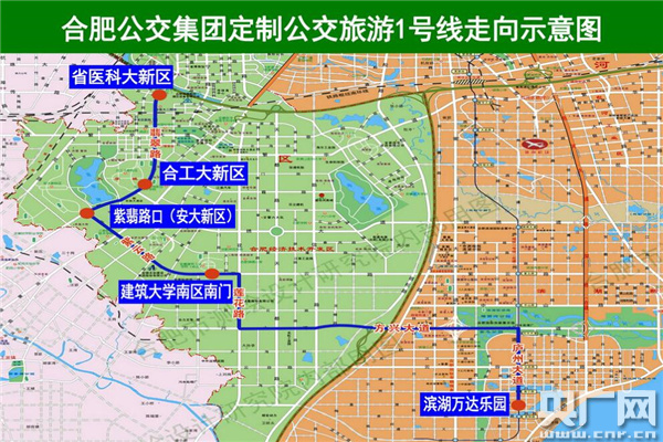 定制公交旅游1號(hào)線線路走向?yàn)椋簭摹笆♂t(yī)科大新區(qū)”發(fā)車,經(jīng)翡翠路~紫云路~蓮花路~方興大道~廬州大道,抵達(dá)“濱湖萬(wàn)達(dá)樂(lè)園”。