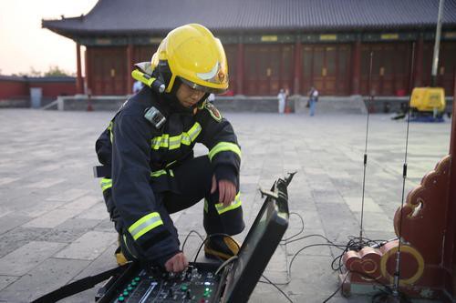2019年9月6日晚,消防隊員從祈年殿四個方向架設移動水炮、消防機器人和云梯車對祈年殿起火部位進行撲救。當晚,北京東城消防支隊聯(lián)合天壇公園舉辦了文物古建應急救援綜合演練。此次演練,包括人員疏散、搶救文物、滅火救援等突發(fā)事件的處置,歷時約40分鐘。