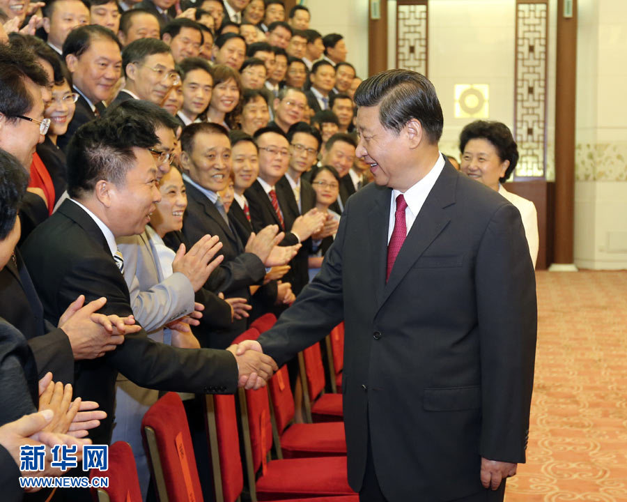 上午9時(shí)30分許,習(xí)近平等領(lǐng)導(dǎo)同志走進(jìn)人民大會(huì)堂河北廳,來(lái)到代表們中間,同大家親切握手,詢(xún)問(wèn)他們工作和生活情況,并同大家合影留念。