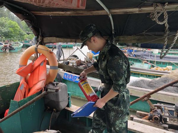 風(fēng)雨影響前,消防人員檢查漁船情況。(圖片來(lái)源:?谂_(tái)記者張瓊提供)