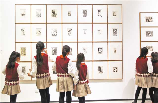 十一月一日,四川美術學院美術館,市民欣賞江敉先生版畫、漫畫等精品。記者 盧越 攝