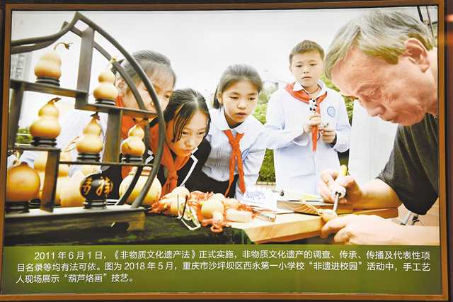 一位頭發(fā)花白的長者低著頭創(chuàng)作“葫蘆烙畫”,吸引了多名學(xué)生圍觀……在國家博物館“偉大的變革——慶祝改革開放40周年大型展覽”第四展區(qū)第三單元,一張“非遺進(jìn)校園”的照片引人注目。據(jù)了解,圖中的長者正是重慶市級非遺項(xiàng)目“葫蘆烙畫”的代表性傳承人張居常。