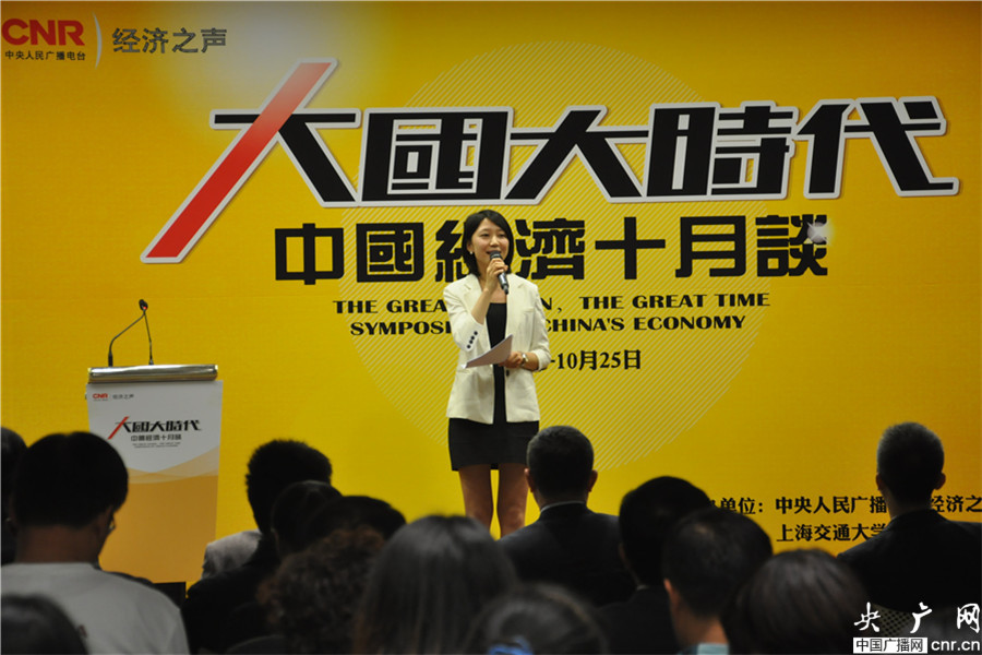 10月20日,由中央人民廣播電臺(tái)經(jīng)濟(jì)之聲、央廣網(wǎng)主辦的《大國大時(shí)代----中國經(jīng)濟(jì)十月談》系列時(shí)事報(bào)告會(huì)之五“貨幣談”,在位于中國人壽中心的上海交通大學(xué)上海高級(jí)金融學(xué)院舉行。今天的主題是《貨幣談:大國的錢怎么辦?》。圖為經(jīng)濟(jì)之聲主持人 梁靖(央廣網(wǎng) 李靜/攝)