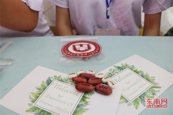 •   經(jīng)濟與法學(xué)系給新生贈送的禮物—種子。   送一顆專屬種子 傳遞“最希望”   “同學(xué),送你一包專屬你的種子。”9月16日上午,經(jīng)濟與法學(xué)系法學(xué)專業(yè)2017級新生高彥婕收到一份特殊的禮物——新生種子。   高彥婕認真觀察著手里的種子,四顆新生種子整齊地放在袋子內(nèi),每一顆種子兩面分別刻著“經(jīng)法輝煌”與“永不言敗”,志愿者告訴高彥婕“經(jīng)法輝煌”是經(jīng)濟與法學(xué)系的口號,“永不言敗”是該系的信仰。