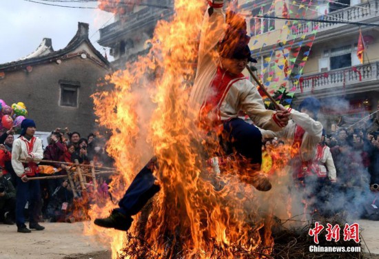 福建莆田“擺棕轎”跳火 寓意生活紅火平安