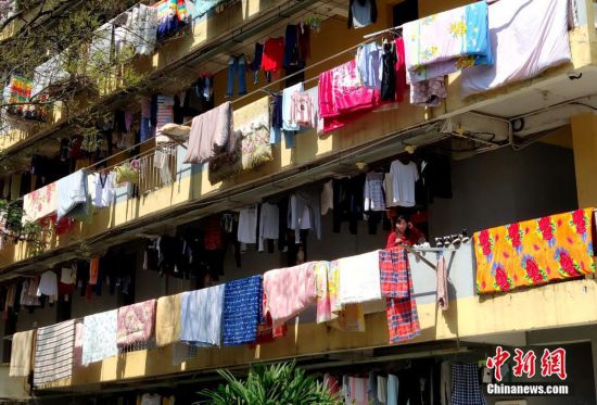 3月12日,福州市暫別陰雨天氣,迎來晴天。福州某高校的一棟宿舍樓外,學生晾曬的被子和衣物“鋪天蓋地”,成為一道別樣的風景。中新社記者呂明攝
