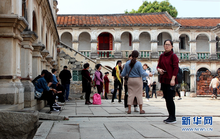 3月16日,游客在漳州臺商投資區(qū)角美鎮(zhèn)曾氏洋樓前參觀。曾氏洋樓始建于1903年,是當(dāng)?shù)刂麅S宅。新華網(wǎng) 劉默涵 攝
