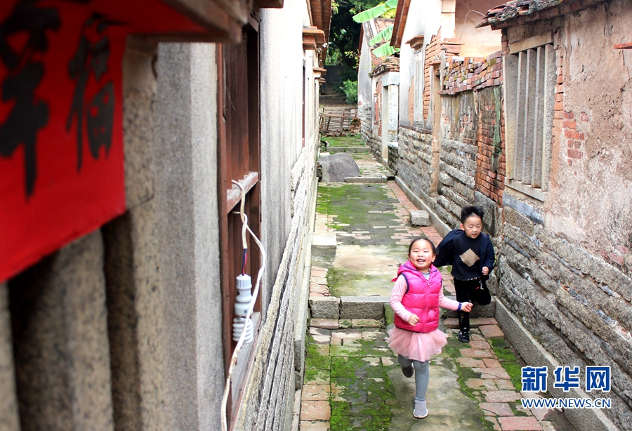 陰雨多日的福建閩南地區(qū)迎來了久違的太陽,3月16日,孩子們在林氏義莊前嬉戲。新華網(wǎng) 劉默涵 攝