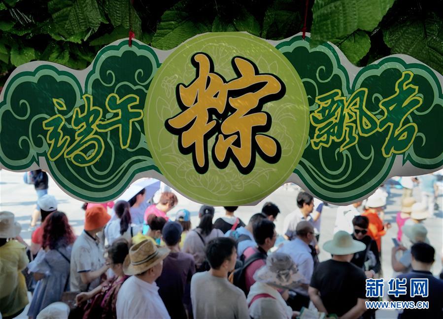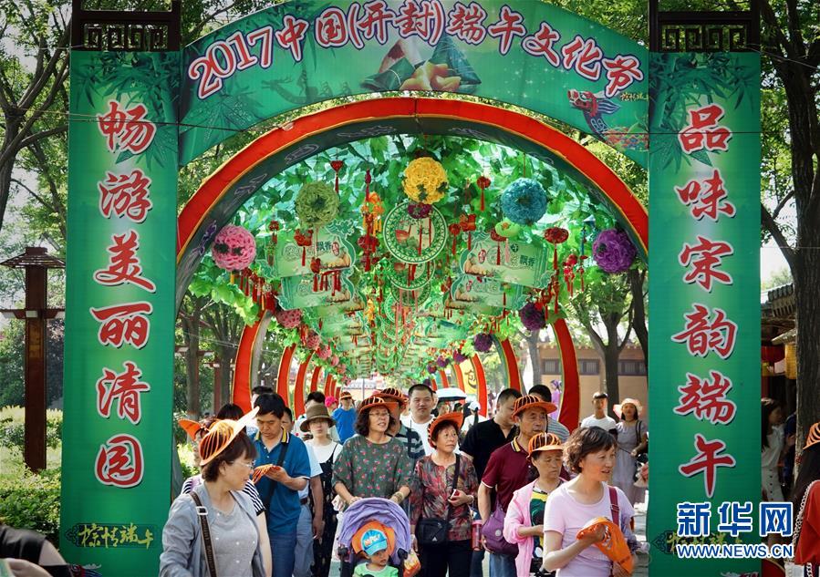 5月28日,在河南省開封市的清明上河園景區(qū),游客們經過端午文化節(jié)主題走廊。 當日是端午小長假的第一天,全國各地舉行豐富多彩的活動,迎接端午節(jié)到來。 新華社記者 李安 攝 -