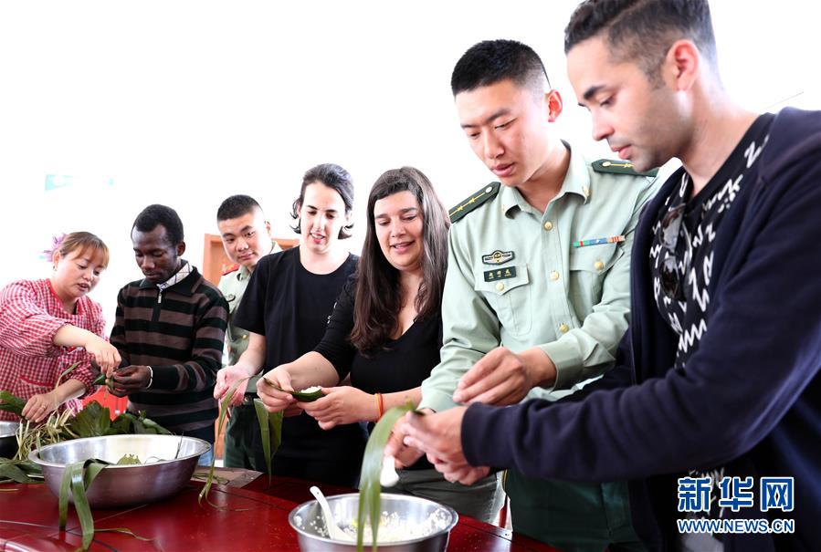 5月28日,大連邊防支隊鹽場邊防派出所的官兵和外國留學生一起包粽子。 當日是端午小長假的第一天,全國各地舉行豐富多彩的活動,迎接端午節(jié)到來。 新華社記者李鋼攝