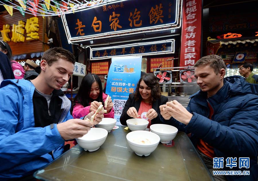 來自清華大學(xué)的中外學(xué)生在陜西省西安市一家泡饃館參加掰饃大賽(2014年11月7日攝)。肉爛湯濃,香氣誘人的泡饃是西安著名的小吃之一。12月6日,我國首條穿越秦嶺的高鐵——西(安)成(都)高鐵全線即將正式開通運營。這條川陜?nèi)嗣衿谂我丫玫目瓦\專線,不僅串聯(lián)起沿線地區(qū)的經(jīng)濟發(fā)展和社會進步,也打通了兩省豐富的旅游資源。從秦腔到川劇,從兵馬俑到武侯祠,從泡饃涼皮到火鍋抄手,這些都隨著西成高鐵的開通變得更為“觸手可及”。跟著高鐵“逛吃逛吃”,將成為廣大游客體驗川陜兩地的新選擇。新華社記者 李一博 攝 來自清華大學(xué)的中外學(xué)生在陜西省西安市一家泡饃館參加掰饃大賽(2014年11月7日攝)。肉爛湯濃,香氣誘人的泡饃是西安著名的小吃之一。12月6日,我國首條穿越秦嶺的高鐵——西(安)成(都)高鐵全線即將正式開通運營。這條川陜?nèi)嗣衿谂我丫玫目瓦\專線,不僅串聯(lián)起沿線地區(qū)的經(jīng)濟發(fā)展和社會進步,也打通了兩省豐富的旅游資源。從秦腔到川劇,從兵馬俑到武侯祠,從泡饃涼皮到火鍋抄手,這些都隨著西成高鐵的開通變得更為“觸手可及”。跟著高鐵“逛吃逛吃”,將成為廣大游客體驗川陜兩地的新選擇。新華社記者 李一博 攝