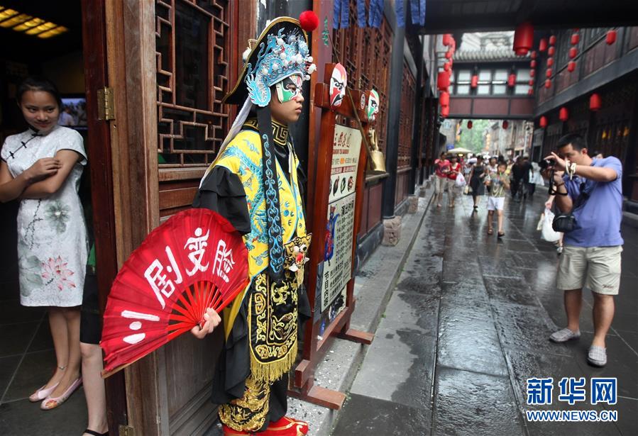 游客在四川省成都市錦里古街上拍攝一名川劇變臉扮相的模特(2011年7月16日攝)。錦里民俗休閑街是成都市一條以傳統(tǒng)川西古鎮(zhèn)為建筑風(fēng)格的旅游休閑街區(qū)。古街上聚集了茶坊、客棧、酒吧、戲臺、各種風(fēng)味小吃、工藝品、土特產(chǎn)等諸多體驗型商戶。12月6日,我國首條穿越秦嶺的高鐵——西(安)成(都)高鐵全線即將正式開通運營。這條川陜?nèi)嗣衿谂我丫玫目瓦\專線,不僅串聯(lián)起沿線地區(qū)的經(jīng)濟發(fā)展和社會進步,也打通了兩省豐富的旅游資源。從秦腔到川劇,從兵馬俑到武侯祠,從泡饃涼皮到火鍋抄手,這些都隨著西成高鐵的開通變得更為“觸手可及”。跟著高鐵“逛吃逛吃”,將成為廣大游客體驗川陜兩地的新選擇。新華社記者 薛玉斌 攝 游客在四川省成都市錦里古街上拍攝一名川劇變臉扮相的模特(2011年7月16日攝)。錦里民俗休閑街是成都市一條以傳統(tǒng)川西古鎮(zhèn)為建筑風(fēng)格的旅游休閑街區(qū)。古街上聚集了茶坊、客棧、酒吧、戲臺、各種風(fēng)味小吃、工藝品、土特產(chǎn)等諸多體驗型商戶。12月6日,我國首條穿越秦嶺的高鐵——西(安)成(都)高鐵全線即將正式開通運營。這條川陜?nèi)嗣衿谂我丫玫目瓦\專線,不僅串聯(lián)起沿線地區(qū)的經(jīng)濟發(fā)展和社會進步,也打通了兩省豐富的旅游資源。從秦腔到川劇,從兵馬俑到武侯祠,從泡饃涼皮到火鍋抄手,這些都隨著西成高鐵的開通變得更為“觸手可及”。跟著高鐵“逛吃逛吃”,將成為廣大游客體驗川陜兩地的新選擇。新華社記者 薛玉斌 攝