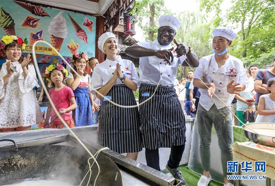 6月27日,在四川省成都市雙流區(qū)黃龍溪鎮(zhèn)的一家面館,一名美國游客(前中)和一名西班牙游客(前左)體驗當(dāng)?shù)匦〕浴耙桓妗钡呐胫啤?2月6日,我國首條穿越秦嶺的高鐵——西(安)成(都)高鐵全線即將正式開通運營。這條川陜?nèi)嗣衿谂我丫玫目瓦\專線,不僅串聯(lián)起沿線地區(qū)的經(jīng)濟發(fā)展和社會進步,也打通了兩省豐富的旅游資源。從秦腔到川劇,從兵馬俑到武侯祠,從泡饃涼皮到火鍋抄手,這些都隨著西成高鐵的開通變得更為“觸手可及”。跟著高鐵“逛吃逛吃”,將成為廣大游客體驗川陜兩地的新選擇。新華社發(fā)(邱海鷹 攝) 6月27日,在四川省成都市雙流區(qū)黃龍溪鎮(zhèn)的一家面館,一名美國游客(前中)和一名西班牙游客(前左)體驗當(dāng)?shù)匦〕浴耙桓妗钡呐胫啤?2月6日,我國首條穿越秦嶺的高鐵——西(安)成(都)高鐵全線即將正式開通運營。這條川陜?nèi)嗣衿谂我丫玫目瓦\專線,不僅串聯(lián)起沿線地區(qū)的經(jīng)濟發(fā)展和社會進步,也打通了兩省豐富的旅游資源。從秦腔到川劇,從兵馬俑到武侯祠,從泡饃涼皮到火鍋抄手,這些都隨著西成高鐵的開通變得更為“觸手可及”。跟著高鐵“逛吃逛吃”,將成為廣大游客體驗川陜兩地的新選擇。新華社發(fā)(邱海鷹 攝)