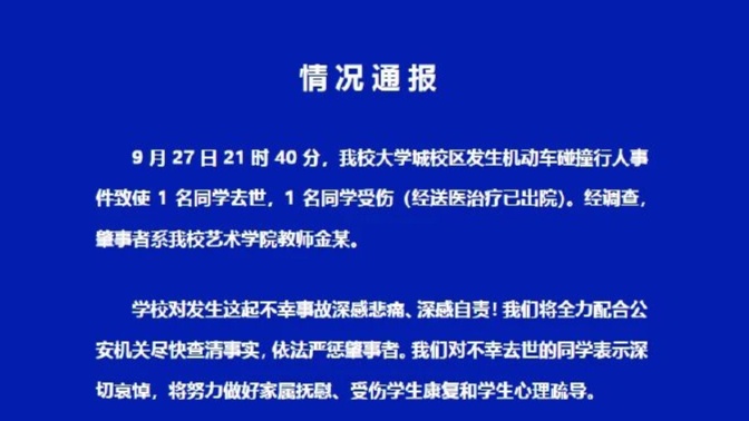華南理工大學(xué)通報“校內(nèi)發(fā)生車禍致1死1傷”:肇事者系學(xué)校教師,將全力配合公安機(jī)關(guān)盡快查清事實,依法嚴(yán)懲肇事者