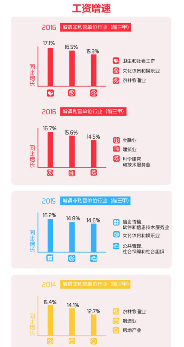 工資高不高是一回事,工資會(huì)不會(huì)漲是另一回事。工資增速較快的行業(yè),總體來說是比較有潛力的!