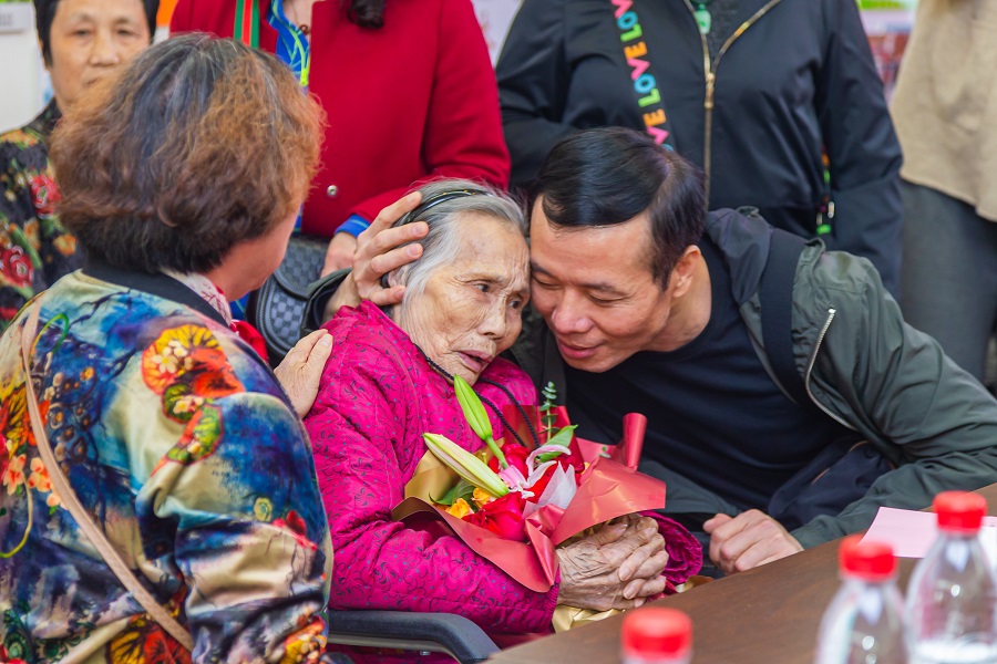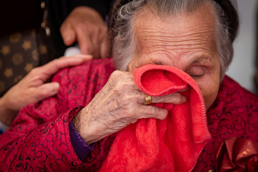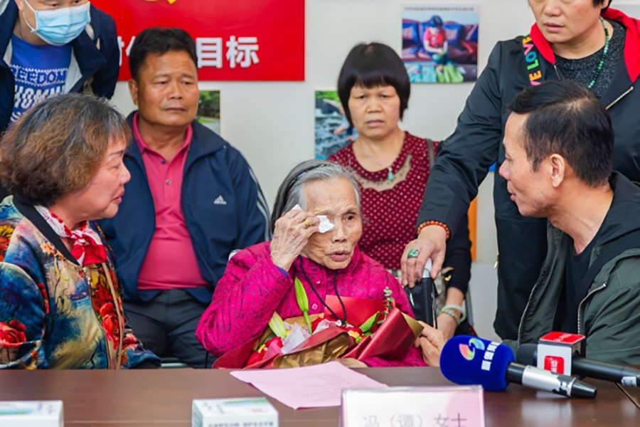 馮鳳英與親人相認(rèn),現(xiàn)場(chǎng)多次擦拭淚水。(央廣網(wǎng)發(fā) 通訊員 林安迪 攝)