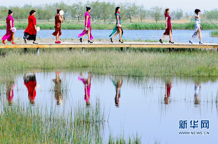 近日,來自甘肅蘭州、武威、張掖等地的200多名女性身穿旗袍在甘肅張掖國家濕地保護(hù)區(qū)內(nèi)表演旗袍秀,展示中華民族傳統(tǒng)服飾魅力。新華網(wǎng)發(fā) (王將 攝)