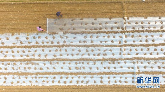 2月25日,山東省聊城市茌平縣賈寨鎮(zhèn)侯樓村的村民在田間給韭菜覆蓋薄膜(無人機拍攝)。 春日時節(jié),人們忙于生產(chǎn)勞動,為新一年的豐收和美好生活打下基礎。 新華社發(fā)(趙玉國 攝)