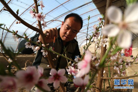 2月26日,甘肅酒泉敦煌市七里鎮(zhèn)秦家灣村農(nóng)民在溫室中為桃花授粉。 春日時節(jié),人們忙于生產(chǎn)勞動,為新一年的豐收和美好生活打下基礎。 新華社發(fā)(張曉亮 攝)