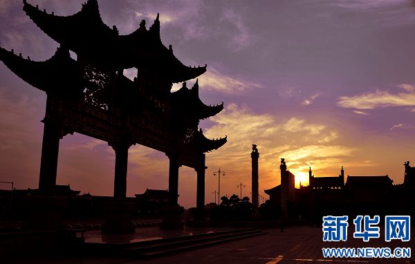 這是晚霞襯映下的河南省宜陽縣一公園內(nèi)的新建仿古牌樓(2012年3月12日攝)。
