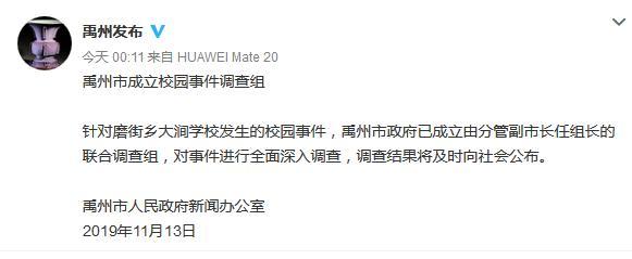 河南省禹州市委宣傳部14日凌晨通過(guò)官方微博發(fā)布消息稱(chēng),針對(duì)磨街鄉(xiāng)大澗學(xué)校發(fā)生的校園事件,禹州市政府已成立由分管副市長(zhǎng)任組長(zhǎng)的聯(lián)合調(diào)查組,對(duì)事件進(jìn)行全面深入調(diào)查,調(diào)查結(jié)果將及時(shí)向社會(huì)公布。