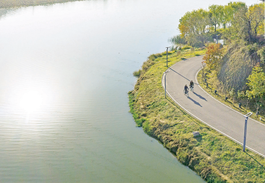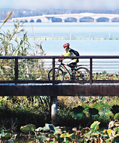 市民騎行在風(fēng)景秀麗的東湖國(guó)家濕地公園。長(zhǎng)江日?qǐng)?bào)記者高勇 攝