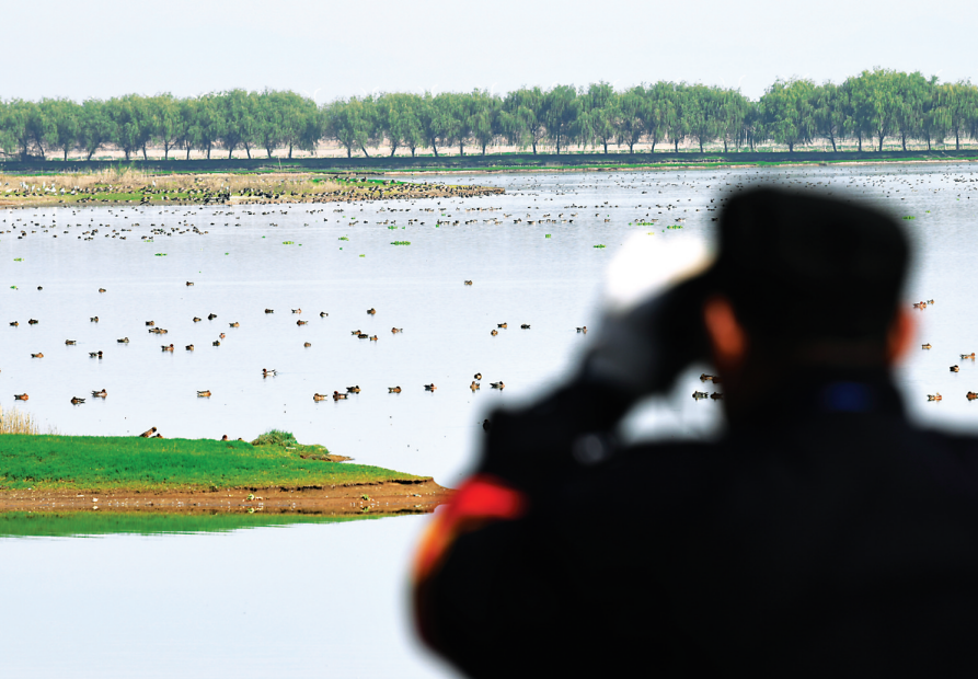 在府河濕地,候鳥保護(hù)志愿者正在觀察候鳥越冬情況。長(zhǎng)江日?qǐng)?bào)記者金振強(qiáng) 攝