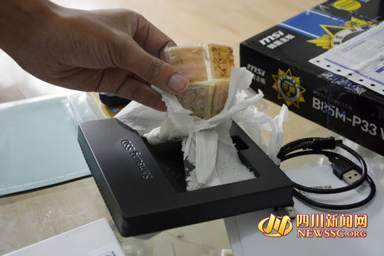 今日中午,四川新聞網(wǎng)記者在趙宇家里看到,他所收到的5塊石頭為邊長2厘米左右的正方形小瓷磚,用透明膠帶粘在一起,裹上紙巾正好能夠填充在本應(yīng)裝放硬盤的長方形凹槽內(nèi)。