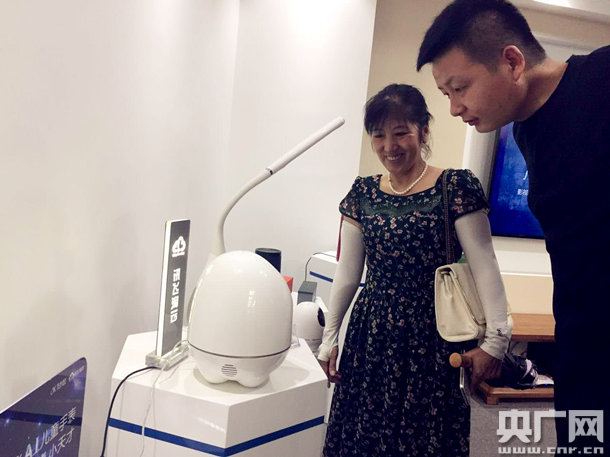 圖為科大訊飛人工智能展廳內(nèi),前來(lái)參觀的市民正與教育陪伴智能機(jī)器人“阿爾法蛋”進(jìn)行語(yǔ)音互動(dòng)、交流 -