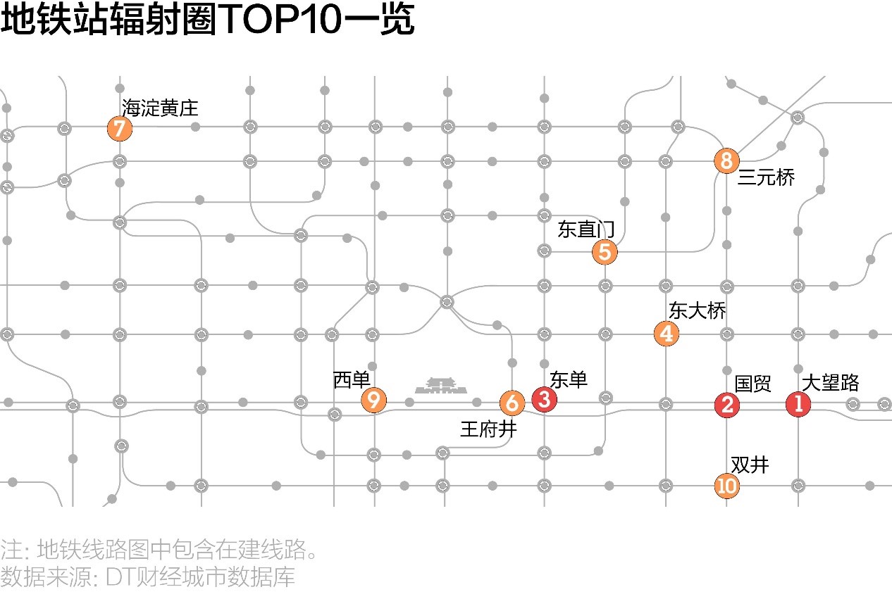 在DT財經(jīng)《報告》對北京405個地鐵站輻射圈的綜合排名中,位于朝陽區(qū)的大望路站奪得第一,國貿(mào)、東單、東大橋、東直門、王府井、海淀黃莊、三元橋、西單與雙井站分列二至十名。