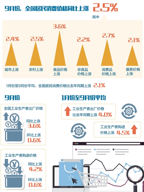 “據測算,9月份CPI同比上漲2.5%,去年價格變動的翹尾影響約為0.5個百分點,新漲價影響約為2.0個百分點。”國家統(tǒng)計局城市司高級統(tǒng)計師繩國慶說。
