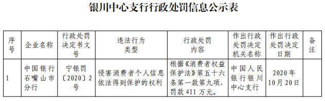 記者關(guān)注到,根據(jù)央行銀川中心支行行政處罰信息公示表顯示,因中國(guó)銀行石嘴山市分行侵害消費(fèi)者個(gè)人信息依法得到保護(hù)的權(quán)利,監(jiān)管部門依據(jù)《消費(fèi)者權(quán)益保護(hù)法》第五十六條第一款第九項(xiàng),對(duì)其作出了罰款411萬(wàn)元的處罰。