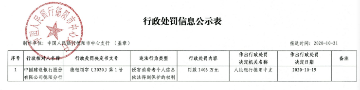 而根據(jù)21日披露的央行德陽(yáng)中支行政處罰信息公示表顯示,建設(shè)銀行德陽(yáng)分行因侵害消費(fèi)者個(gè)人信息依法得到保護(hù)的權(quán)利,被監(jiān)管部門罰款1406萬(wàn)元。