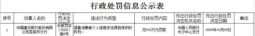 此外,建設(shè)銀行婁底分行同樣是因?yàn)榍趾οM(fèi)者個(gè)人信息依法得到保護(hù)的權(quán)利,被監(jiān)管部門罰款533萬(wàn)元。