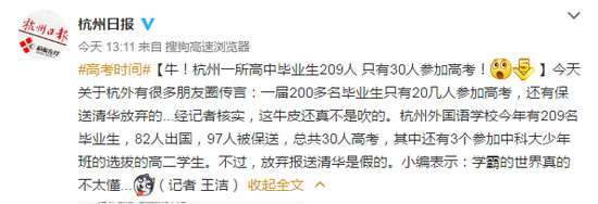 今天關(guān)于杭外有很多朋友圈傳言:一屆200多名畢業(yè)生只有20幾人參加高考,還有保送清華放棄的...經(jīng)記者核實(shí),這牛皮還真不是吹的。杭州外國(guó)語(yǔ)學(xué)校今年有209名畢業(yè)生,82人出國(guó),97人被保送,總共30人高考,其中還有3個(gè)參加中科大少年班的選拔的高二學(xué)生。