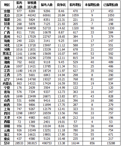 從各地報名情況來看,北京、廣東、湖北、山東、四川、貴州、浙江等省份為較熱的地區(qū),報名人數(shù)較多,與這些地區(qū)招錄人數(shù)多有很大關(guān)系。從競爭比來看,福建目前競爭比最高,招錄261人,有8351人通過審核,競爭比為22.3:1,其次為甘肅,北京排第三位。