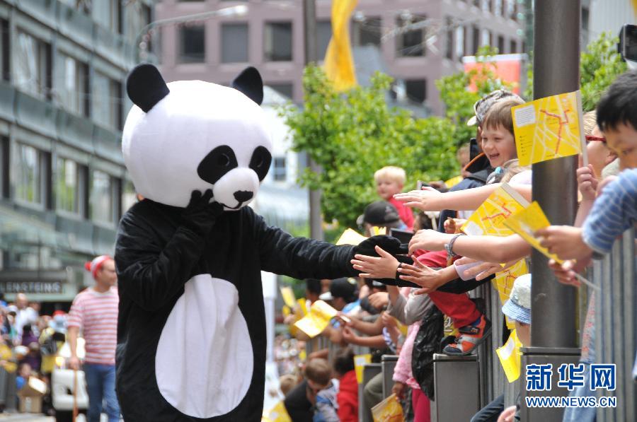 12月14日,在新西蘭首都惠靈頓,中國青年政治學院學生藝術團成員裝扮成大熊貓與市民互動。