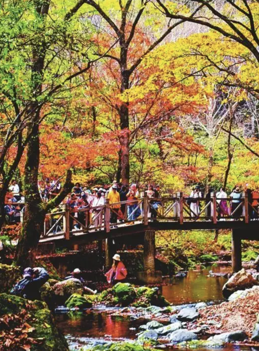 10月中旬,本溪關(guān)門山已浸染成一幅五彩斑斕的秋景油畫。楓王觀景臺擠滿了各地的游人,他們時而為整片紅葉林發(fā)出驚嘆,時而用相機(jī)捕捉這“霜葉紅于二月花”的景致。
