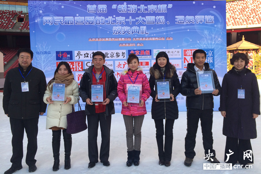北京2013年度暢游“北京杯”首屆網(wǎng)民最喜愛的滑雪、溫泉頒獎典禮現(xiàn)場,主辦方為獲獎雪場頒獎后合影。(央廣網(wǎng)記者 何微攝)