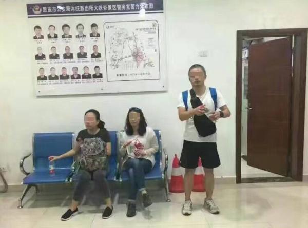 涉事游客及同行人員被帶至公安機(jī)關(guān)。網(wǎng)曝打人女游客(左一)稱自己是湖北省某高官的妹妹。