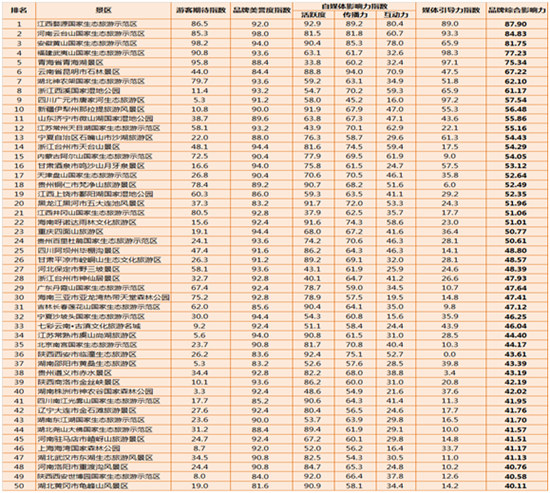 為全面評估國家生態(tài)旅游示范區(qū)品牌影響力,人民網(wǎng)輿情監(jiān)測室旅游大數(shù)據(jù)中心發(fā)布2017年度中國生態(tài)旅游示范區(qū)排行榜(Top50)。榜單以國家生態(tài)旅游示范區(qū)游客期待程度、旅游目的地好評度、媒體報道影響以及官方認證微博、微信為評價對象,綜合考察游客期待指數(shù)、品牌美譽度指數(shù)、媒體引導(dǎo)力以及自媒體影響力(活躍度、傳播力和互動力)四個維度。通過海量數(shù)據(jù)分析和數(shù)理模型計算,全面呈現(xiàn)國家生態(tài)旅游示范區(qū)品牌綜合影響力的發(fā)展現(xiàn)狀。