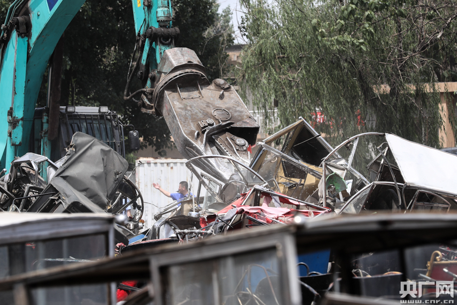 隨著指揮人員一聲令下,擺放在北京天交解體廠的“黑摩的”開始“解體”。工作人員使用切割機等設備進行分解。