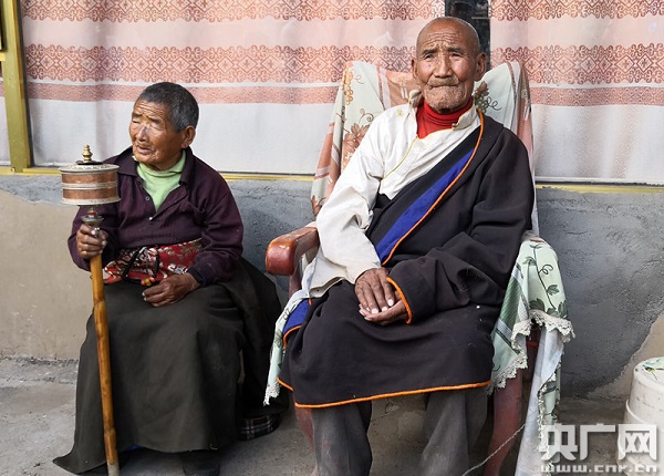 毛爾蓋鎮(zhèn)阿藏村96歲的羅讓老人(右)接受記者采訪(中央廣播電視總臺央廣記者 夏恩博 攝)