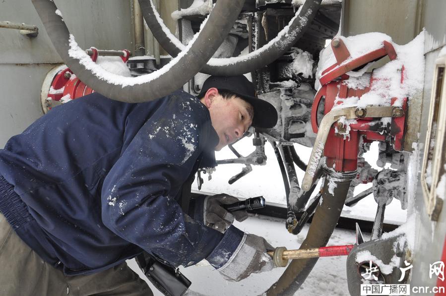 檢修人員正對(duì)機(jī)車(chē)管路進(jìn)行檢測(cè)(央廣網(wǎng)發(fā) 白世平 攝)