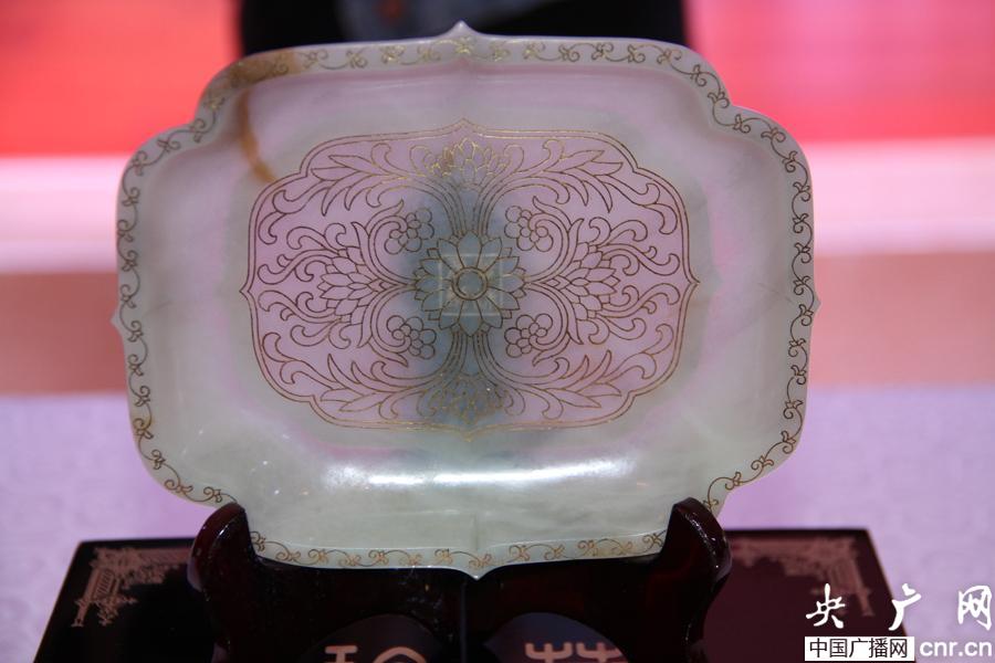 青白玉錯(cuò)金卷草紋海棠盤(央廣網(wǎng)記者 廉軍 攝)