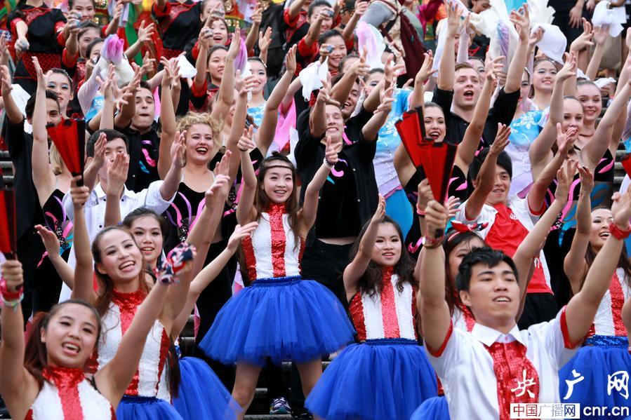 19日,澳門國際青年舞蹈節(jié)2014在大三巴牌坊舉行巡游表演,來自世界各地的25支隊(duì)伍沿著巡游路線各展才藝,與市民游客近距離接觸,為周末的澳門再添火熱氣氛。(央廣網(wǎng)記者 毛強(qiáng) 攝)