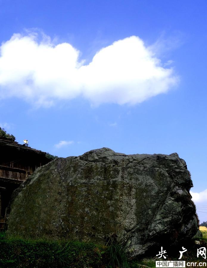 更為驚奇的是,這個二十來戶的苗寨還有10多個巨大石頭“相伴”,且全部是由一塊組成,屬于單體巨石。其中最小至少300噸重,最大達400多噸。這些巨石往往安插在兩棟木房中間,遠看像一座“小山”,恰好成為了這里苗家的天然“墻壁”,這實屬罕見。經(jīng)觀察,10多塊巨石表面不規(guī)則,多呈暗灰色。由于石頭大,附近農(nóng)戶多用其來當“曬場”。