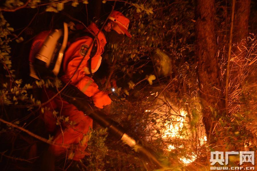 次日凌晨1時(shí)15分,該支隊(duì)支隊(duì)長(zhǎng)張洪順帶前指及參戰(zhàn)官兵到達(dá)火場(chǎng)。經(jīng)堪察,林火為中低強(qiáng)度地表火,植被以云南松和密灌為主。在風(fēng)力和地形的影響下,火線正向東北方向蔓延,如不及時(shí)控制火勢(shì),將對(duì)周邊林區(qū)和當(dāng)?shù)厝罕娚?cái)產(chǎn)安全造成嚴(yán)重威脅。來(lái)不及多想,5分鐘后,張支隊(duì)長(zhǎng)迅速將參加官兵分為兩個(gè)戰(zhàn)斗分隊(duì),采取“兩翼推進(jìn),鉗形夾擊”的戰(zhàn)法,利用常規(guī)滅火機(jī)具與水泵滅火配合的方法開(kāi)展撲打。一班班長(zhǎng)張吉洪帶水泵分隊(duì)在火場(chǎng)西北側(cè)打開(kāi)突破口后風(fēng)水結(jié)合、泵車并用,采取“一線平推”戰(zhàn)術(shù)撲打迅速控制火勢(shì);由于風(fēng)力較大,火勢(shì)較猛,二班班長(zhǎng)陳金龍帶攻堅(jiān)分隊(duì)對(duì)肆虐的大火進(jìn)行4次沖鋒,2名官兵手、臉被荊棘刺傷,戰(zhàn)斗卻一直沒(méi)有停息。5月1日4時(shí)00分,經(jīng)全體官兵近4小時(shí)連夜奮戰(zhàn),大火被全部撲滅。